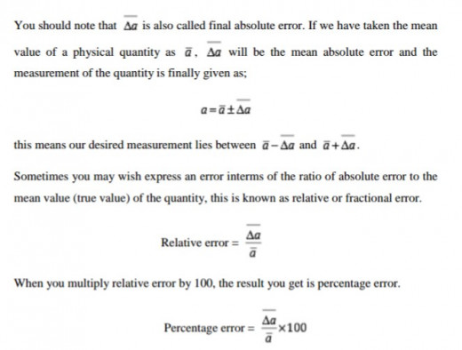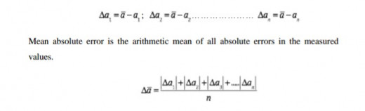 We define absolute error as the difference in the magnitudes of true value and the measured value of a physical quantity. We sometimes refer absolute error to actual error. If you observed a1, a2, a3 ….. an as you n different readings of a physical quantity in an experiment then the absolute errors are given as;