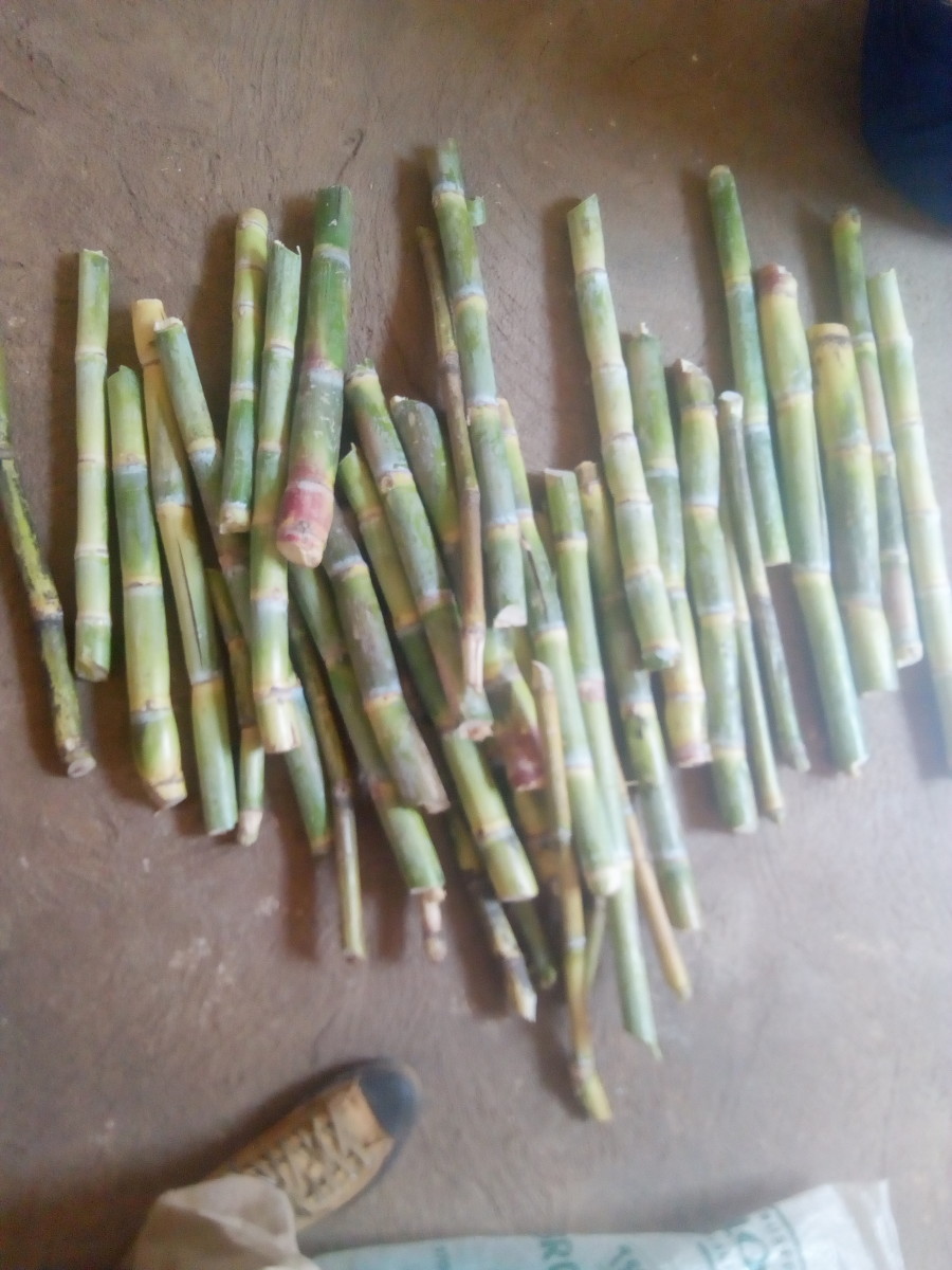 The first step to locally manufacture sugar from sugarcane is to peel the sugarcane which involves removing the outer skin of the sugarcane. This step is very important as it makes sugar juice extraction in subsequent steps, much easy. Peeling the sugarcane can be done by using a sharp knife and it can be done while the sugarcane is in small parts.