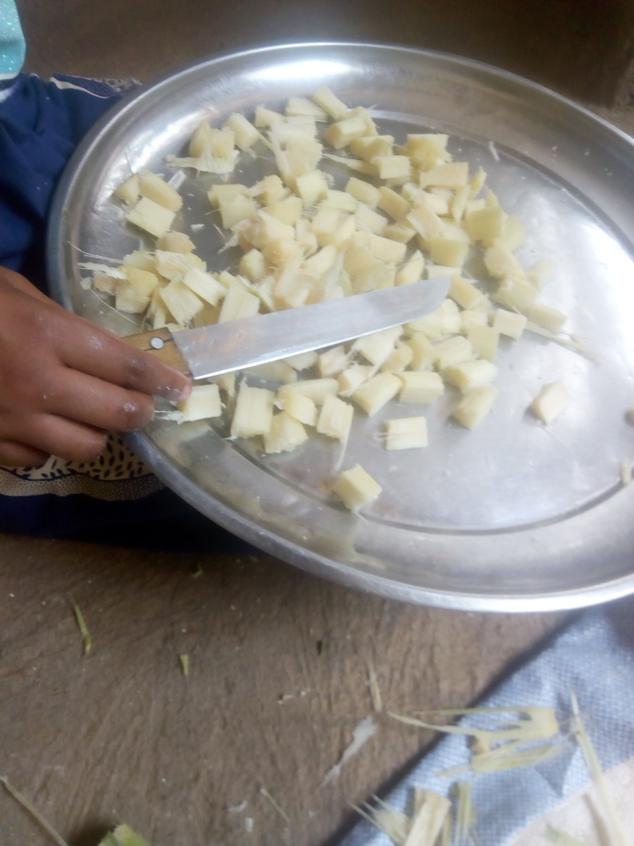 After the sugarcane which are in small parts, have been peeled, the next step is to cut the peeled sugarcane into small pieces and this can also be completed by a sharp knife. The purpose of cutting the peeled sugarcane into small pieces is to ease juice extraction in our subsequent steps.