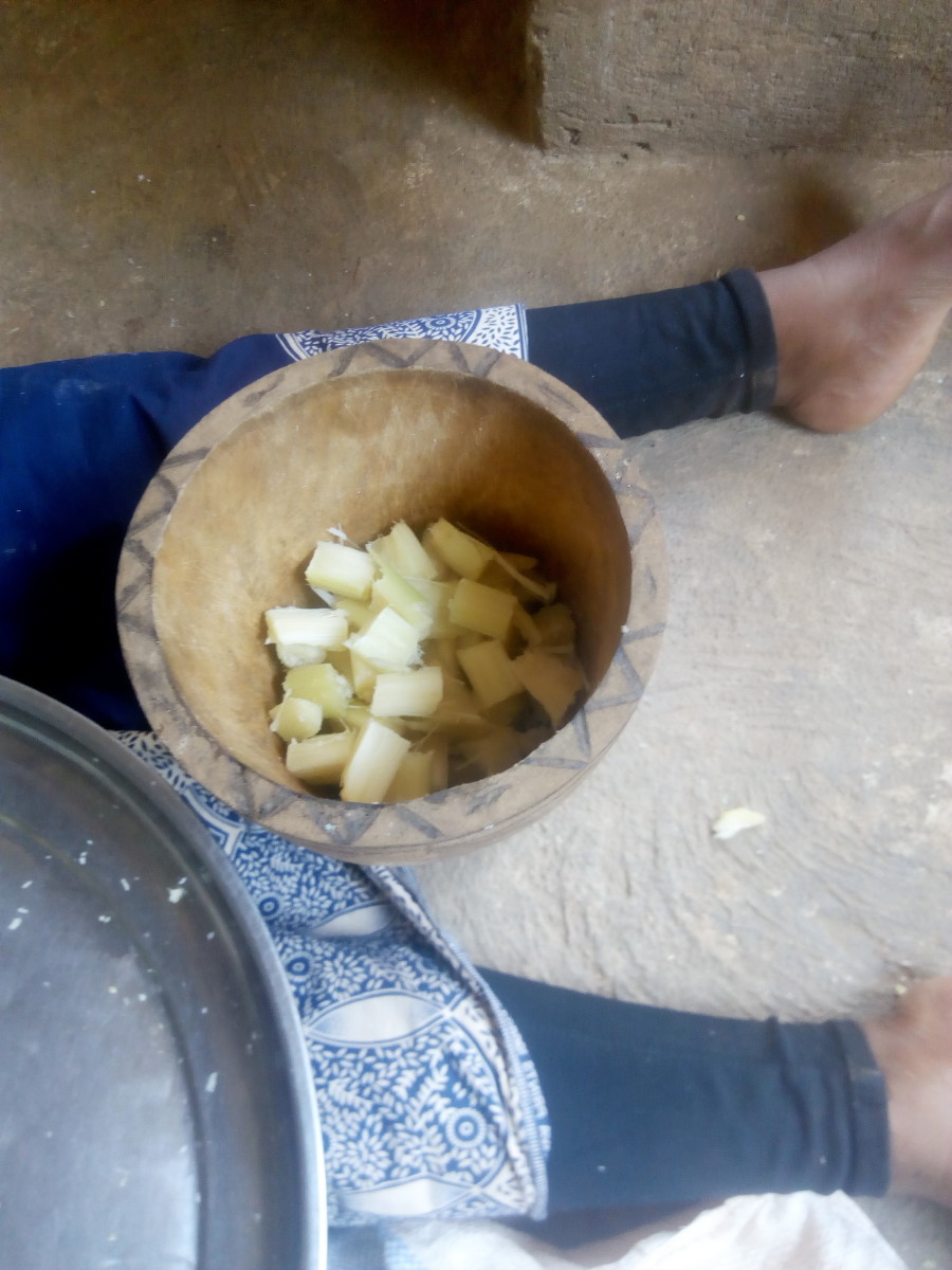 After successfully making the peeled sugarcane into small pieces, the next step is to pound the small pieces in our local mortar, using a pestle. This process can also be completed using an electric blender. The purpose of pounding is to make the juice extraction much easy in our subsequent steps as well. Keep in mind that we are using our local way to manufacture sugar from sugarcane.
