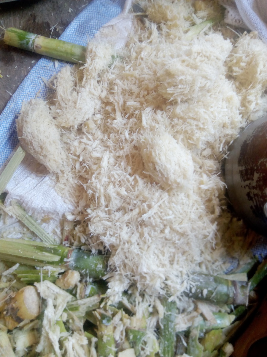 Step 4: Squeeze the pounded sugarcane to extract the juice