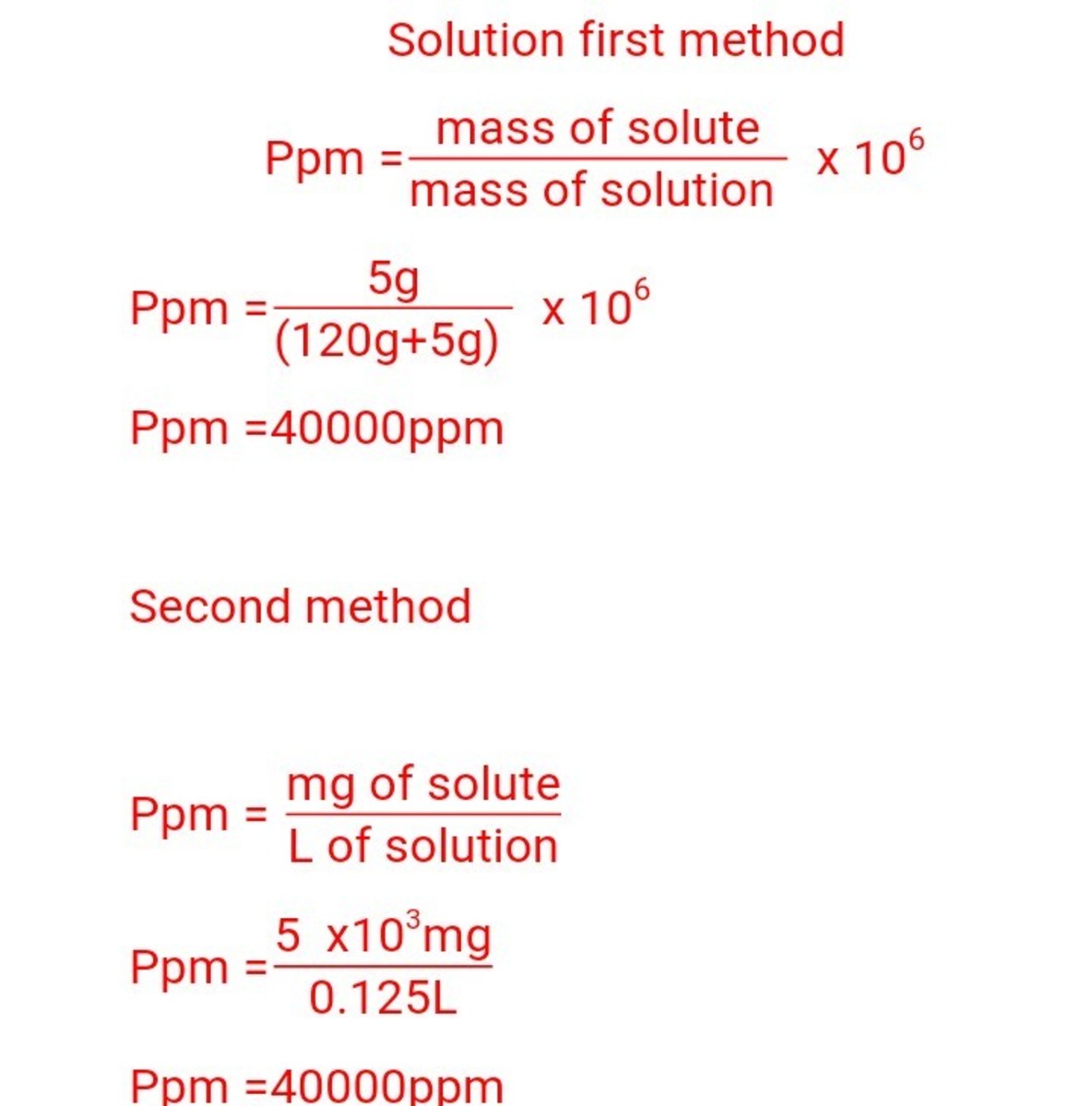- Parts per million, ppm = (mass of solute/mass of solution) x 10^6