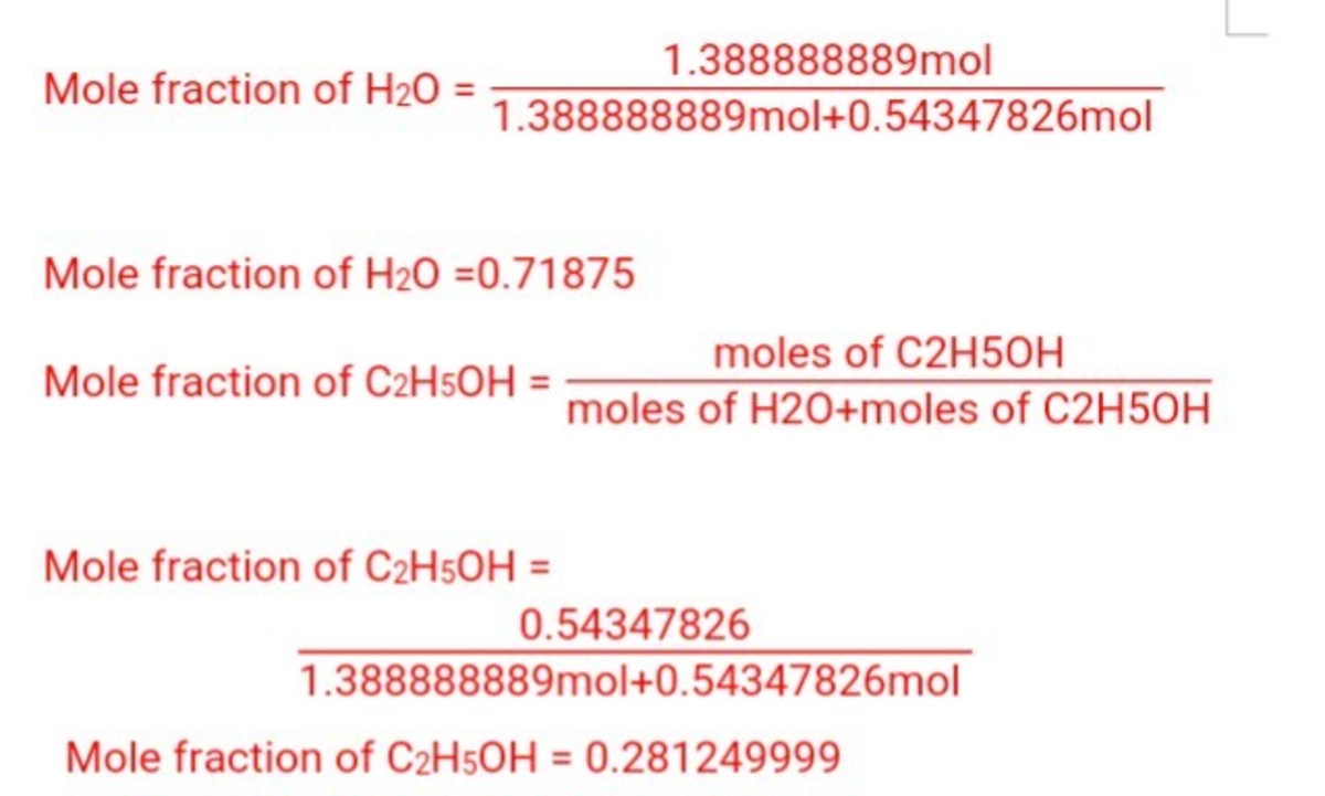 1. A solution is prepared by mixing 25g of water, H2O and 25g of ethanol C2H5OH. Determine the mole fraction of each substance?